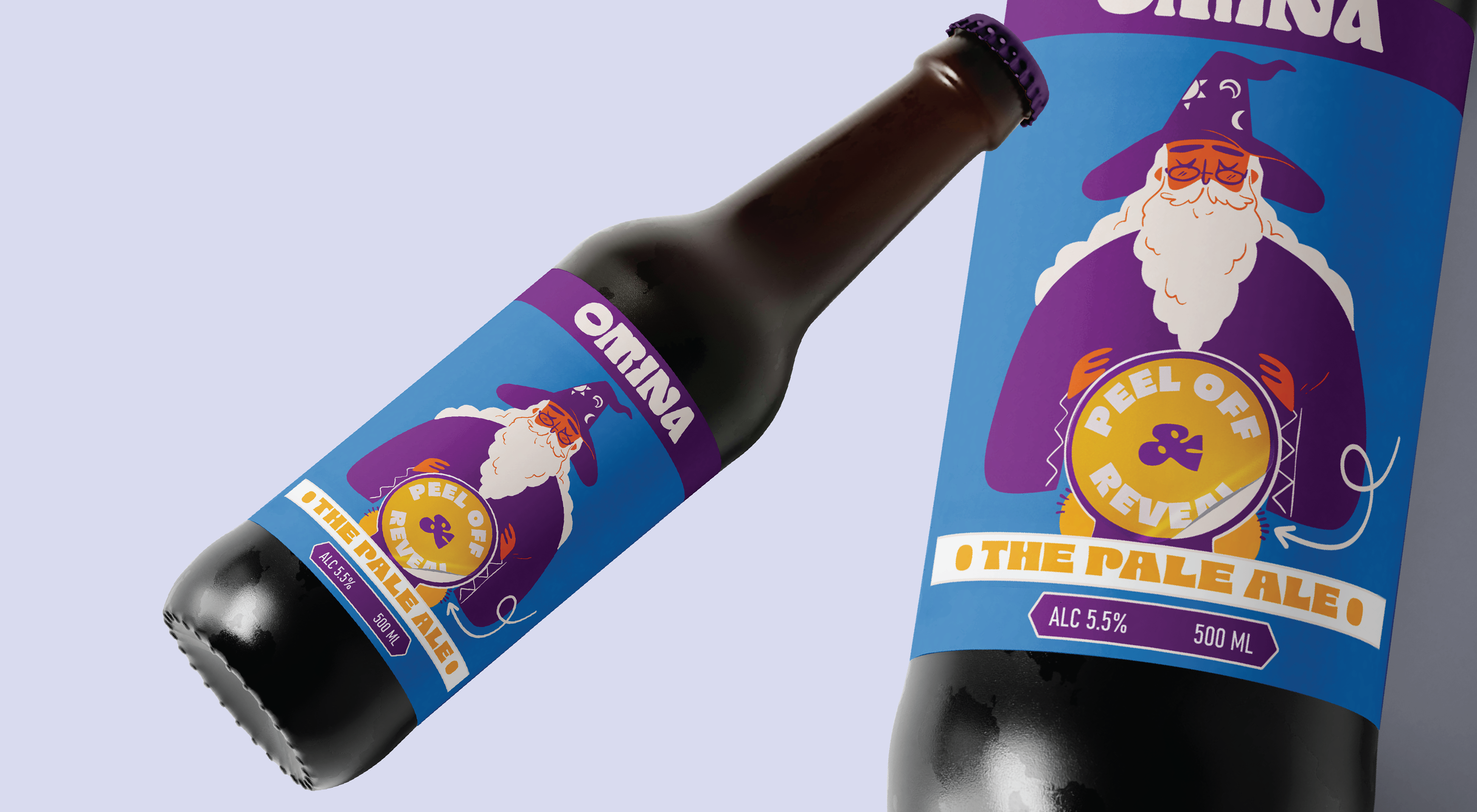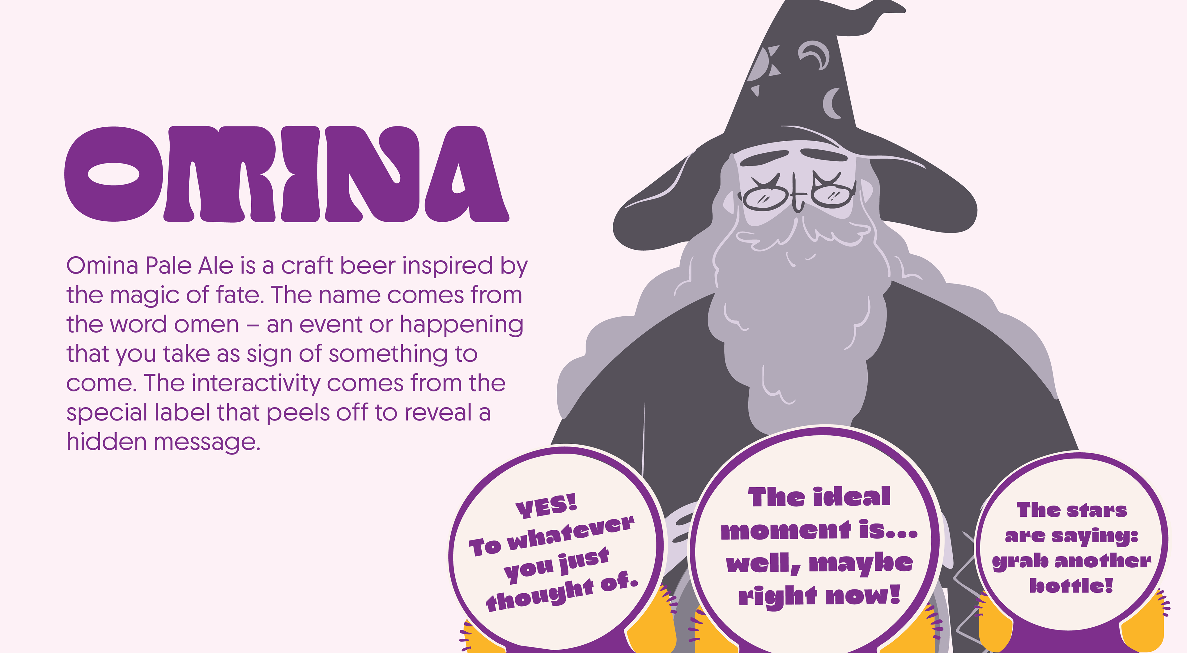 Omina Pale Ale is a craft beer concept created for a university project exploring interactive packaging design. Inspired by the idea of omens—those little signs that hint at what’s to come—each bottle hides a secret message beneath its label. Peel it back to reveal your fortune.